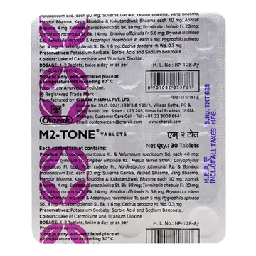 M2-Tone products are available in different forms, including tablets and syrups. Charak M2-Tone Tablets and Syrups are the most popular products from M2-Tone. The brand's syrups and tablets are formulated using natural ingredients and are safe for long-term use. These products are designed to help regulate menstrual cycles, relieve menstrual pain, improve reproductive health, and promote overall well-being. The ingredients are carefully chosen to ensure that they are effective in balancing hormones and improving reproductive health